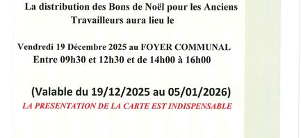 Distribution des bons de Noël 🎄 Vendredi 19 décembre 2025 Foyer Communal 9h30 à 12h30 et 14h00 à 16h00 Présentation de la carte indispensable