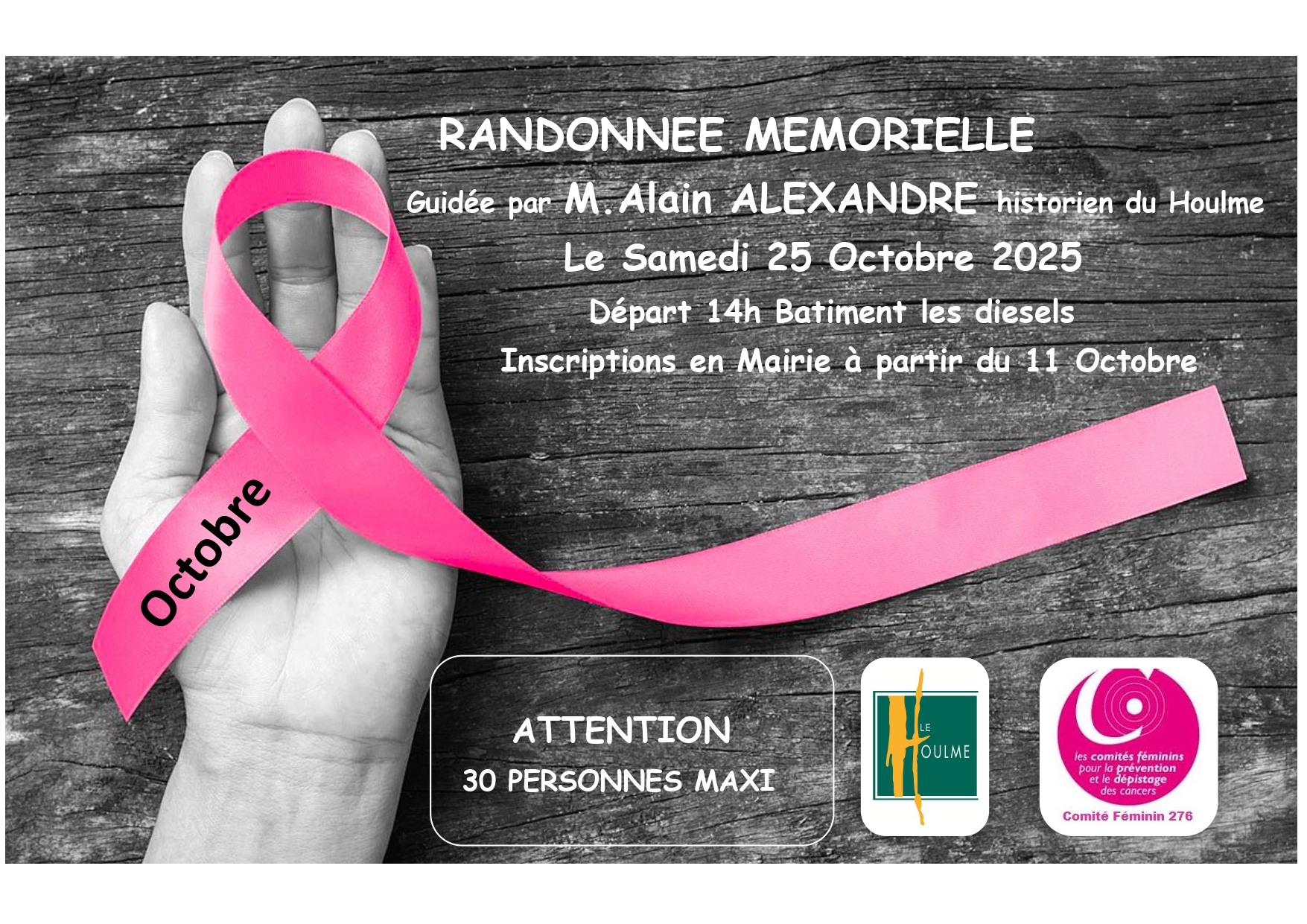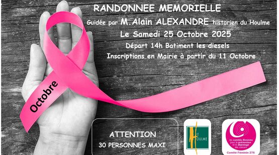 Participez à une balade guidée par M. Alain Alexandre, historien du Houlme, dans le cadre d’Octobre Rose, le mois de sensibilisation au dépistage du cancer du sein.