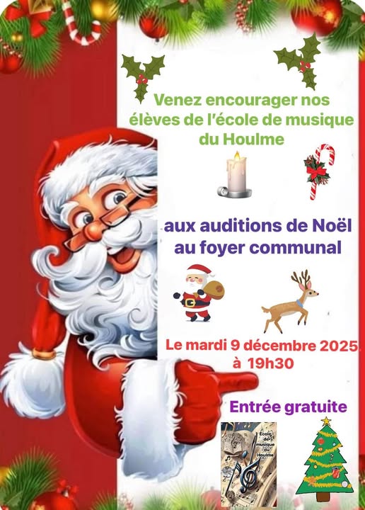 Venez écouter et soutenir les élèves de l’école de musique du Houlme lors des auditions de Noël qui auront lieu le mardi 9 décembre 2025 au foyer communal du Houlme à 19h30.