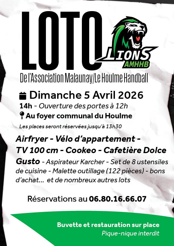 L' association de handball organise son loto de printemps au Foyer municipal le dimanche 5 avril à 14h00. Nombreux lots ! Ouverture des portes à 12h00, réservation obligatoire...